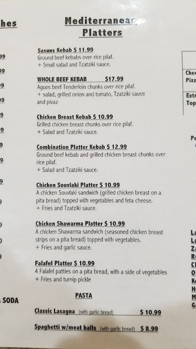 The menu at Sasuns Cafe offers a diverse selection of Mediterranean and Armenian dishes, combining elements from grills, bakeries, pizza offerings, and sandwich shops. The menu is organized into several key categories to suit various dining preferences.