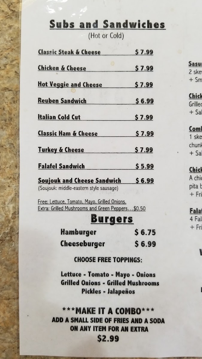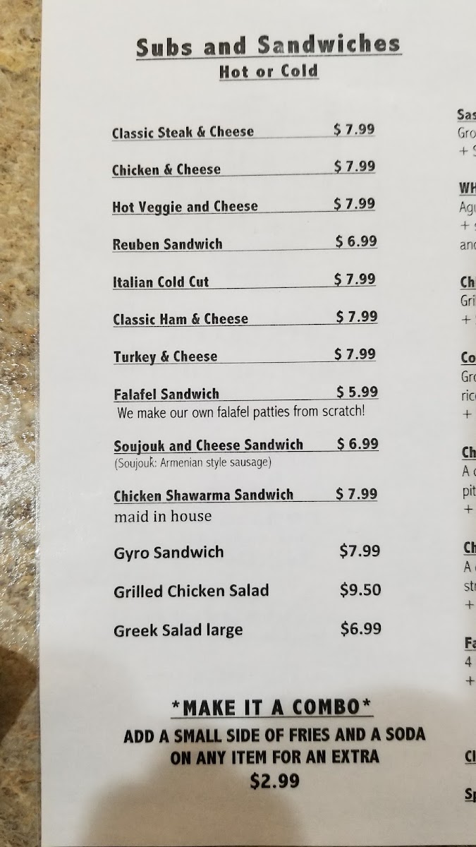 The menu is suitable for casual dining occasions, with options that cater to light meals, lunch, or dinner. It allows for both quick ordering of sandwiches and subs as well as more substantial platters for a fuller dining experience. The range includes vegetarian options, made-from-scratch items, and classic Mediterranean preparations, providing a balance between grilled meats, fresh salads, and baked goods.