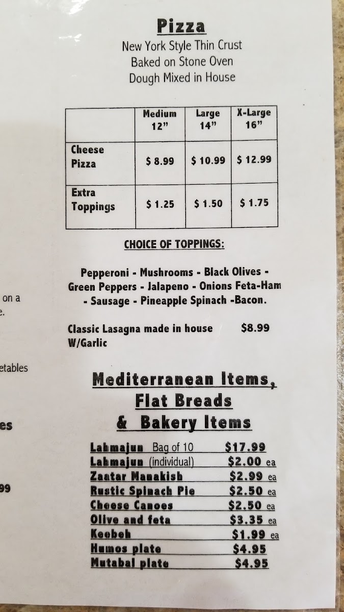 - Pizza and Flatbreads: The menu features pizzas such as pepperoni pizza as well as Mediterranean flatbreads like za’atar manakish and lahmajun, offering both traditional and casual options for quick meals.